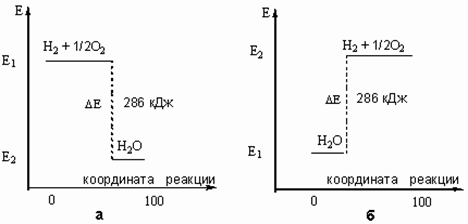 Рис. 2. Графическое изображение теплового эффекта (Q = D Е): а) экзотермической реакции горения водорода; б) эндотермической реакции разложения воды под действием электрического тока. Координату реакции (горизонтальную ось графика) можно рассматривать, например, как степень превращения веществ (100% - полное превращение исходных веществ).