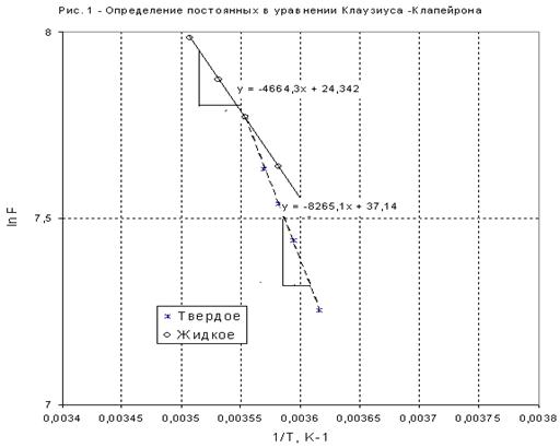 4. На рис. 4 приведены кривые зависимостей давлений насыщенного пара от температуры для твердого и жидкого вещества, рассчитанные по уравнениям . Эти линии определяют параметры фазовых равновесий «тв ® газ» и «ж ® газ». При имеющейся информации линию фазовых равновесий «тв ® ж» проводим с учетом углового коэффициента этой линии в тройной точке