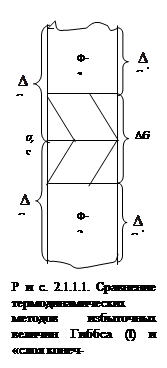 В методе слоя конечной толщины рассматривается поверхностный слой, имеющий определенные размеры (позиция II на рис. 2.1.1.1). Его термодинамические параметры включают как поверхностную энергию, так и энергию объема слоя, имеющего те же свойства, что и объемная фаза. Этот метод не рассматриваем. В методе Гиббса все экстенсивные величины выражаются в виде избытков по сравнению со значением этих величин в реальных объемных фазах.