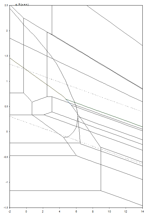 Сравнение диаграмм, построенных при различных значениях активностей ионов в растворе, показывает, что с уменьшением активностей ионов снижаются потенциалы растворения компонентов сплава и потенциал перепассивации мельхиора по никелю. Области активной коррозии расширяются, а области пассивности наоборот уменьшаются и сдвигаются в щелочную область.