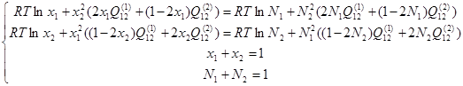 Обозначим через х мольные доли компонентов в α-фазе, а через N – мольные доли компонентов в γ-фазе, и учитывая условия нормировки их на единицу, можно систему уравнений (1.11) с учётом (1.4) и (1.7) переписать в следующем виде: