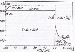 Фазовая диаграмма состояния Ni – O приведена на рис. 1.4 [14].