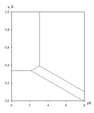 Как видно из рис. 1.5., на диаграмме рН – потенциал системы Cu – H2O можно выделить 4 области преобладания различных фаз: