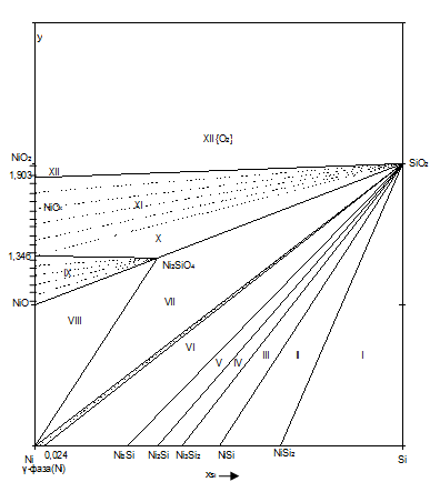 10. Ni2SiO4 - SiO2 - NiOx, 1,346<x<1,903; (XI)