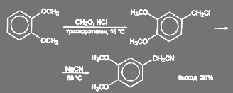 При синтезе папаверина З,4-диметоксифенилацетонитрил получают так называемым цианметилированием вератрола. Реакция, вероятно, идет как минимум в две стадии: на первой стадии образуется 3,4-диметоксибензилхлорид, который под действием цианида натрия превращается в нитрил: