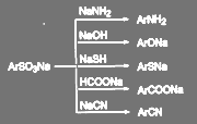 Так же как и атом галогена, сульфогруппа может быть замещена не только гидроксильной или аминогруппой, но и другими нуклеофилами. При нагревании до 200—300 °С щелочные соли аренсульфокислот могут быть превращены в амины, фенолы, тиолы, карбоновые кислоты или нитрилы: