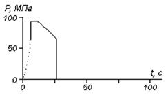 Рис. 6. Профиль давления для расчета 4. Пунктиром показано изменение давления в узле впрыска на стадии заполнения