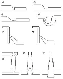 Рис. 7. Конструкции литников, затрудняющие процесс уплотнения а) тонкий впускной литник, б) длинный впускной литник (> 1 мм), в) длинный переход от разводящего литника к впускному, г) и е) туннельные литники с длинным переходом к впускному литнику, д) туннельный литник с длинным впускным литником (>2 мм), ж) – з) – пережимы, и) ступеньки
