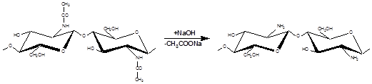 Хитозан является b-(1-4)-2-амино-2дезокси-D-гликополисахаридом, т.е. аминополисахаридом, полученным при удалении ацетильной группы из положения С2 в хитине в результате обработки его в жестких условиях раствором щелочи, что позволяет заместить ацетильные группы хитина аминогруппами: