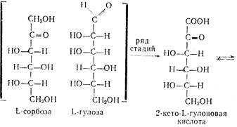 Аскорбиновая кислота является производным моносахарида L-ряда. Это строение подтверждено синтезами, в которых исходными веществами являются L-сорбоза (наиболее доступна) или L-гулоза, превращающиеся в 2-кето-Ь-гуло-новую кислоту—ключевой полупродукт в синтезе аскорбиновой кислоты:
