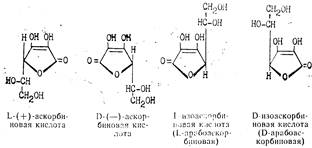 Аскорбиновая кислота имеет два асимметрических атома углерода в положениях 4 и 5 и образует четыре оптических изомера и два рацемата: