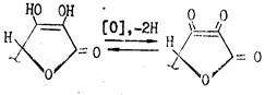 Кислотность обусловлена фенольной НО-группой. Аскорбиновая кислота легко образует соли — наиболее известна ее натриевая соль (аскорбинат натрия). Аскорбиновая кислота очень легко окисляется и обладает сильной восстановительной способностью. Процесс окисления аскорбиновой кислоты протекает сложно, начальной стадией его является образование т. н. дегидроаскорбиновой кислоты под влиянием кислорода воздуха или других окислителей. Этот процесс является обратимым: