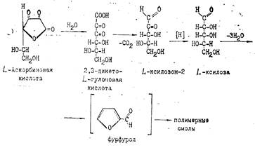 При рН<7 в процессе окислительного и гидролитического расщепления дегидроаскорбиновая кислота, например, превращается в 2,3-дикето-L-гулоновую кислоту. Последняя под влиянием повышенной температуры декарбоксилируется и превращается в L-ксилозон-2. Ксилозон восстанавливается аскорбиновой кислотой в L-ксилозу, которая циклизуется в фурфурол путем дегидратации: