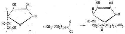 Из других свойств аскорбиновой кислоты следует отметить ее способность к образованию простых и сложных эфиров. Наиболее известен пальмитат аскорбиновой кислоты, который используют для витаминизации пищевых продуктов: