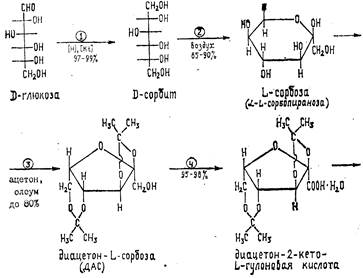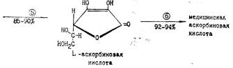 5. Метод Рейхштейиа. Синтез L-аскорбиновой кислоты из 2-кето-L-гексоновой кислоты. Основное сырье (D-глюкоза) и вспомогательные реагенты, применяемые для синтеза, используются в пищевой и химической промышленности. Метод нашел применение во многих странах, в т. ч. СССР. Усовершенствован во ВНИХФИ, в настоящее время отдельные стадии его совершенствуются в НПО «Витамины».