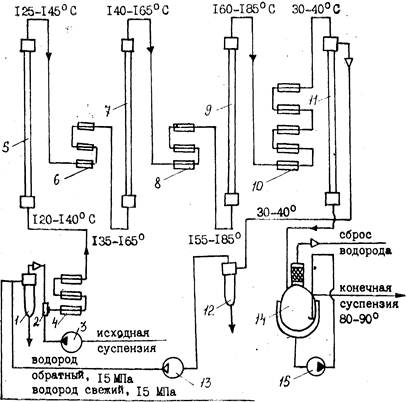 1 - маслоотделитель; 2 — смеситель; 3-—насос высокого давления; 4, 6. 8 — пароподогреватели высокого давления; 5, 7, 9 - - реакторы высокого давления: 10 — холодильник высокого давления; 11—сепаратор высокого давления; 12 — брызугоуловитель высокого давления; 13 — циркуляционный компрессор; 14 — сепаратор с брызгоуловителем; 15 — циркуляционный насос