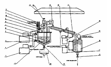 Рис. 1. Схема пилотной установки: 1 - аппарат для получения порошка, 2 - термостат для подачи «горячего» теплоносителя; 3 - термостат для подачи «холодного» теплоносителя; 4,7 – трехходовые краны; 5 - мешалка; 6 - термопара; 8 - загрузочный кран; 9,19- вакуумметры; 10 - обратный холодильник; 11 - электродвигатель мешалки; 12 - штатив; 13 - вытяжной зонт; 14 - частотный регулятор скорости вращения вала; 15 - прибор ТРМ 1, показывающий температуру; 16 - конденсатор паров водяной; 17 — низкотемпературный конденсатор; 18, 21 - криостаты; 20 - сборник конденсата; 22 - кран слива конденсата; 23 - кран для выгрузки