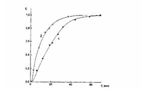 Рис. 2. Зависимость массовой доли растворившегося ПЭНП (е) от времени процесса приготовления раствора с конечной концентрацией по полимеру, равной 15,7 %, при скорости вращения мешалки 125 мин"1 и температуре теплоносителя 75 (1) и 95 (2) °С. Точки - эксперимент, сплошные линии – расчет