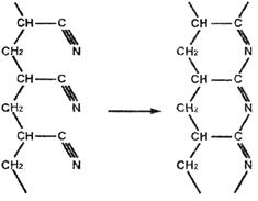 Термическое воздействие (выше 150°С) вызывает необратимые изменения в химическом строении макромолекулы полиакрилонитрила, являющиеся результатом последовательного взаимодействия групп – CN между собой с образованием циклических структур. Это свойство полиакрилонитрила используется при изготовлении углеродных волокон (волокон специального назначения).