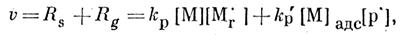 р – константы скоростей роста соответственно в водном растворе акрилонитрила и на глобулах полиакрилонитрила; [М] – концентрация акрилонитрила в водном растворе; [М]адс – эффективная концентрация акрилонитрила, адсорбированного на глобулах; [М'р] – концентрация свободных радикалов в растворе; [р-] – концентрация глобул в реакционной смеси.