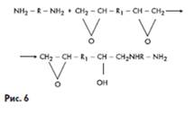 Амины также реагируют с раскрытием эпоксигруппы и образованием гидроксила, а затем образуют более сложные пространственные полимеры. Амины реагируют со смолой довольно активно, поэтому добавление их должно производиться незадолго перед употреблением смолы. Количество вводимых отвердителей в эпоксидную смолу определяется в зависимости от содержания эпоксигрупп или от эпоксидного числа согласно формуле
