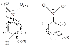 Рассмотрим вначале замещение в молекуле, содержащей ориентант II рода, например нитрогруппу. При атаке пара- положения возникает переходное состояние (I), а при атаке мета- положения – переходное состояние (II):