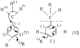 При гомолитическом замещении бензольное кольцо атакуется нейтральным радикалом, существующем как кинетически независимая частица, либо возникающем только в переходном состоянии, в момент реакции. Место вступления радикала, атакующего молекулу монозамещенного бензола, должно зависеть от чередующейся полярности, наведенной имеющимся заместителем. Однако радикалы замещают преимущественно водородные атомы в орто- и пара- положениях к имещемуся заместителю, будь то ориентант I или II рода. Для разъяснения этого вопроса необходимо сравнить переходные состояния, возникающие при атаке радикалом орто- и пара- положений, с одной стороны, и мета- положением с другой.