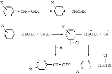 Арильные радикалы можно использовать для введения алькильных заместителей в ароматическое ядро. Арильный радикал генерируется при разложении арилдиазониевого иона, катализируемого медью, и затем атакует алкен. Образующийся радикал окисляется Cu (II) с образованием карбениевого иона, который превращается в алкен или галогенид: