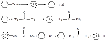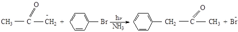 Реакция имеет цепной характер, так как радикал-анион фенилацетона может переносить электрон к бромбензолу: