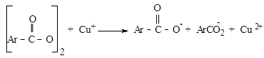 Генерирование радикалов при окислительно-восстановительных реакциях происходит путем одноэлектронного переноса; в них могут принимать участие такие ионы, как Fe 2+ и Fe 3+, а также Cu + и Cu 2+. Найдено, что ионы Cu + сильно ускоряют разложение арилпероксидов, например: