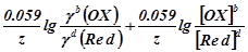 z - число электронов, участвующих в редокс-переходе в ОХ+ze - dRed; a(OX) и a(Red) - активности соответственно окисленной и восстановленной форм вещества, моль/дм3.