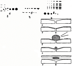 Пробу можно сконцентрировать в узкую стартовую зону при погружении пластины в растворитель, для которого значения Rf всех компонентов близки к 1, и пропусканием его несколько выше зоны нанесения пробы, после чего элюирование прекращают, а пластину быстро высушивают. Подобную операцию повторяют несколько раз. Для вязких и разбавленных проб эффективен способ контактного нанесения. На рис. 3 показана последовательность операций нанесения пробы по этому методу: