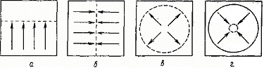 Рис. 4. Типы элюирования в ТСХ: а – линейное; б – линейное (горизонтальное); в – круговое; г – антикруговое с подачей на нее элюента с одной или с обеих сторон.
