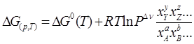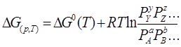 Здесь ∆G0(T) – изменение энергии Гиббса для реакции, протекающей при той же температуре, но при условии , что все реагенты находятся при стандартном давлении PB=PC=…=PY=PZ=…=1.
