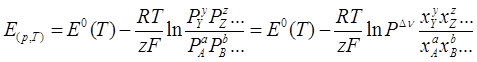 где F = 96500 А×с/(г×экв) = 26,8 А×ч/(г×экв) – число Фарадея, z- число электронов, участвующих при электрохимическом превращении одной молекулы вещества. Значение ЭДС обратимого топливного элемента можно записать