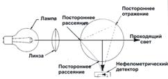 4. Работа на соотношении сигналов обусловливает нечувствительность приборов к окраске. Поскольку проходящий свет и рассеянный проходят примерно одинаковое расстояние через пробу, то их ослабление вызванное окраской раствора или частиц, одинаково. При работе по соотношению сигналов воздействие ок раски сильно уменьшается.