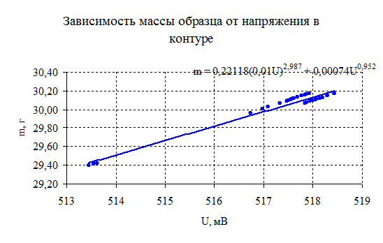 Из приведенного графика, очевидно, что вид зависимости между массой образца и напряжением контура, не зависит от параметров среды и хода протекания процесса. Вид данной кривой будет зависеть, только от параметров установки, температуры протекания процесса и материала из которого выполнен образец.