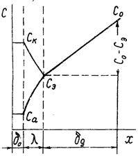 Этот слой называется δд – диффузионным слоем (он больше диффузионной части двойного электрического слоя δд > δ0). Чтобы определить потенциал электрода при протекании тока, в уравнение Нернста подставляют концентрацию реагирующих веществ (или термодинамическую активность) у поверхности электрода, отсюда
