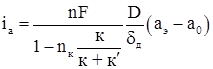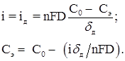 где f – коэффициент термодинамической активности; аэ=fсэ. При наличии в растворе избытка фона (электролита, участвующего в переносе тока, но не участвующего в электродной реакции) плотность тока диффузии должна быть равна плотности тока реакции на электроде: