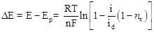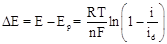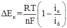 Последние уравнения – уравнения электродной концентрационной поляризации, связывающие величину отклонения потенциала электрода от равновесного значения при изменении плотности тока. Когда плотность тока стремится к предельному значению id, концентрационная поляризация бесконечно возрастает, если, начиная с какого-то значения потенциала электрода, не станет возможным протекание новой электродной реакции (например разряд ионов Н+).
