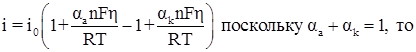 Таким образом, из уравнений катодного, и анодного концентрационного перенапряжения следует, что данный вид перенапряжения начинает сказываться лишь при больших плотностях тока. Так, при id > i разность (