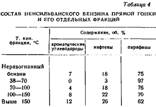 В большинстве случаев состав бензина прямой гонки соответствует составу исходной сырой нефти; таким образом, сырье с большим содержанием парафинов дает бензин, в котором преобладают эти же углеводороды. Содержание ароматических и нафтеновых углеводородов в отдельных фракциях бензина обычно увеличивается с повышением температуры кипения фракции. Об этом свидетельствуют данные табл. 4, помазывающие распределение углеводородов в различных фракциях пенсильванских бензинов прямой гонки.