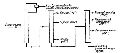 Первичная перегонка сырой нефти с получением шести довольно широких фракций, является лишь очень грубым разделением. Упрощенная схема такой первичной перегонки приведена на рис. 1.