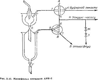 При отборе фракций, выкипающих до 320 °С, в холодильник подают воду, в рубашки приемников наливают холодную воду. Перед началом перегонки краны манифольда ставят в следующие положения: кран А — 1,3, 4\ кран Б— 5, 6; кран Г закрывают; кран В открывают; кран Ж и кран-зажим 3 полностью открывают. Аппарат включают в электросеть, поднимают печь. Включают потенциометр и нагрев дна печи и колонки. Включают вакуумный насос. Постепенным завинчиванием крана-зажима 3 остаточное давление доводят до 0,0013 МПа (10 мм рт. ст.). Нагрев регулируют так, чтобы перегонка началась через 2,0—2,5 ч. Кран Д не открывают до тех пор, пока не установится равновесие в колонне.