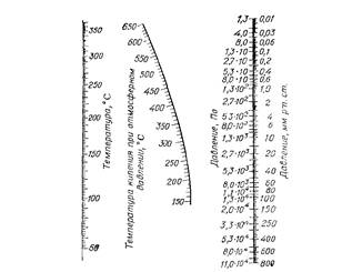 Рис. 3.13. Номограмма для пересчета температур кипения в вакууме на температуры кипения при нормальном давлении