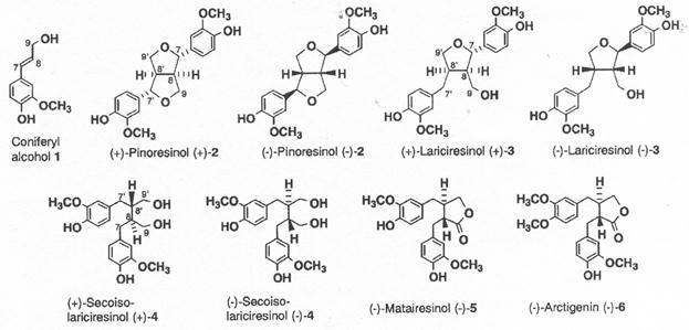 Лигнаны - класс фенилпропаноидных метаболитов широко представленный в растительном мире, особенно у покрытосеменных и голосеменных видов; встречаются как в свободном состоянии, так и в форме гликозидов, чаще всего это димеры [26] и, редко, олигомеры [27].
