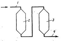 1,4 — подача исходной и отвод умягченной воды; 2 — натрий- катионитовый фильтр; 3 — хлор-аиионитовый или совместный натрий—хлор-ионитовый фильтр