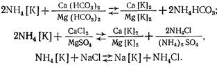 Как видно из реакций обмена, в фильтрате образуются соли аммония, соответствующие имеющимся в воде анионам. Аммоний-катионированная вода умягчается, а щелочность ее имеет такую же величину, как и у исходной воды.