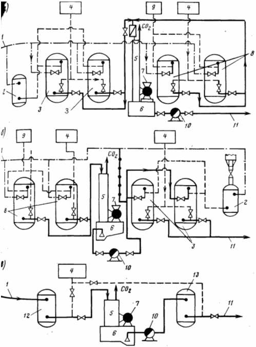 Рис. 20.15. Схемы параллельного (а), последовательного (б) и совместного (в) водород-натрий-катионитового умягчения воды.