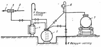 1 — отвод 1% регенерационного раствора кислоты; 2 — эжектор; 3 — подача воды; 4 — мерный бак; 5, 7 — стационарная и железнодорожная цистерна; 6 — промежуточный бачок